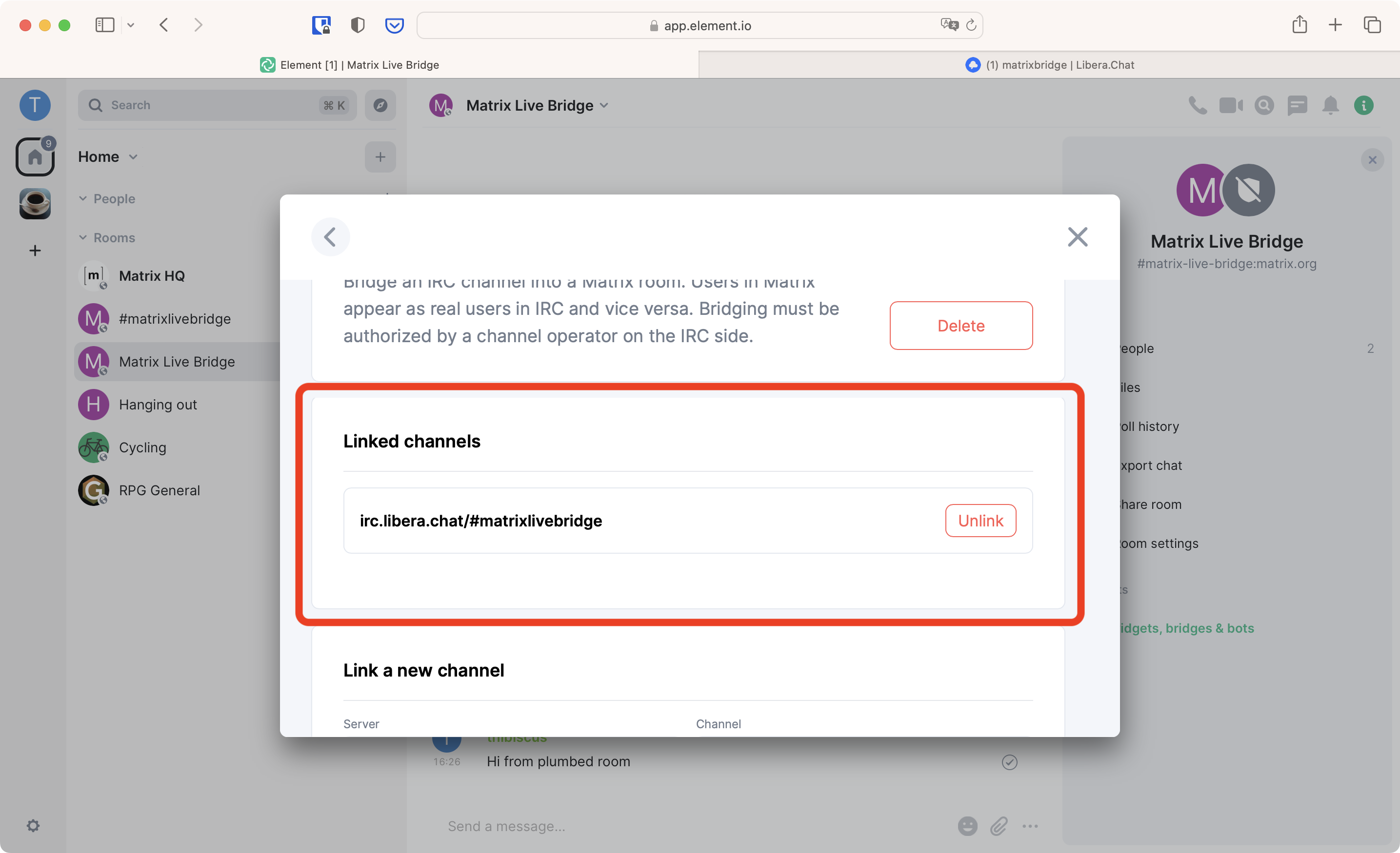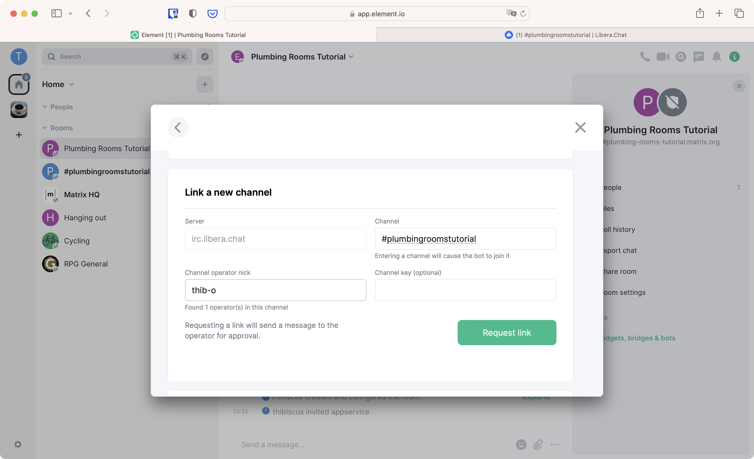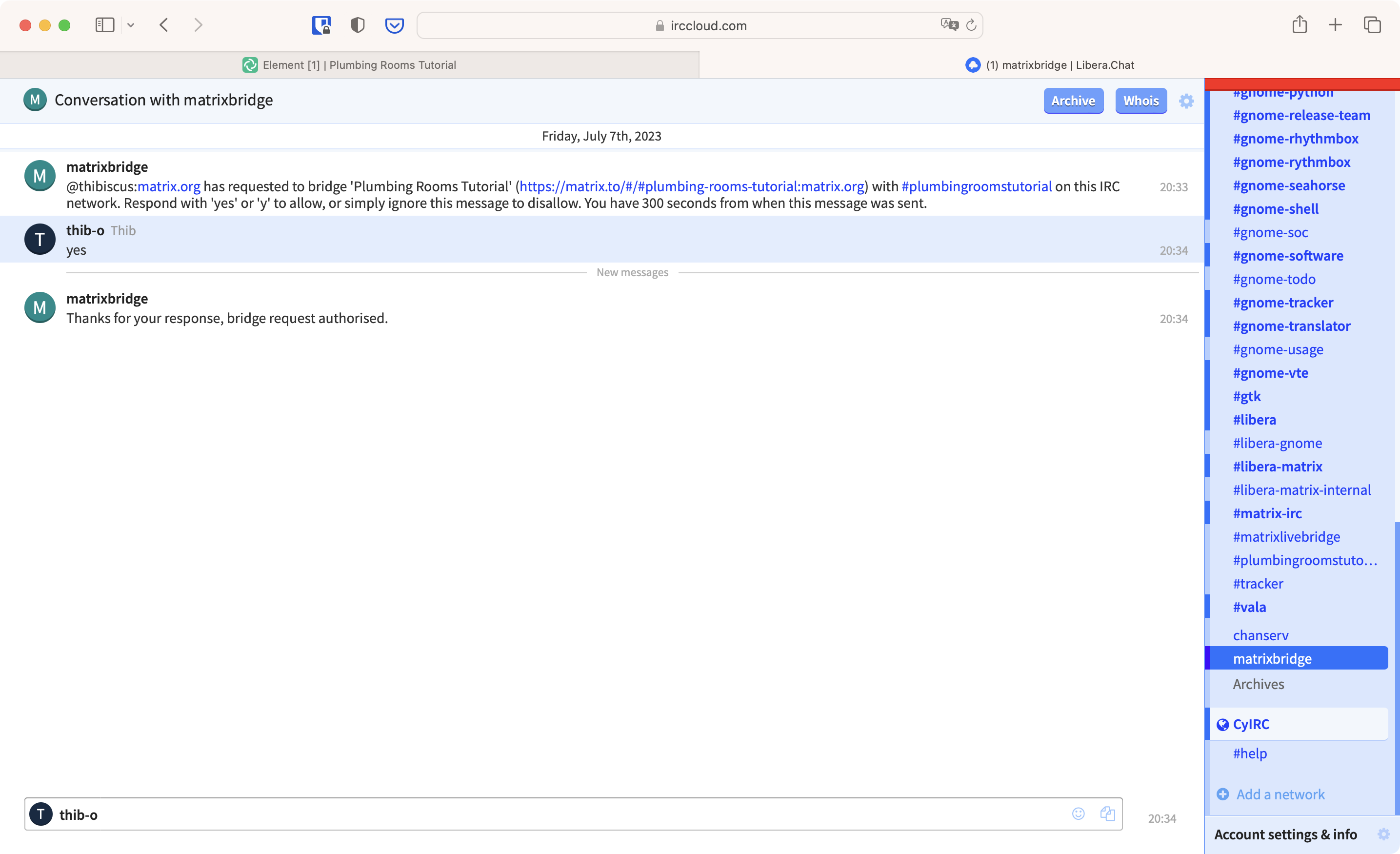 If they accept, the room will be plumbed into the IRC channel. Again, please be mindful of the remote side of the bridge and don’t send plumbing requests out of the blue: IRC chanops will very likely turn them down if they don’t know who is sending them or who is controlling the room.